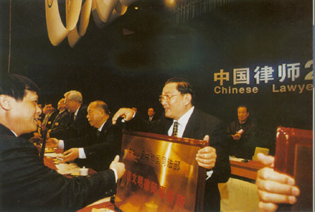 2001年律師大會中央政法委書記羅干將“部級文明律師事務所”牌授予開物律師事務所
